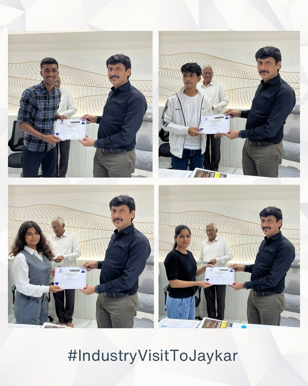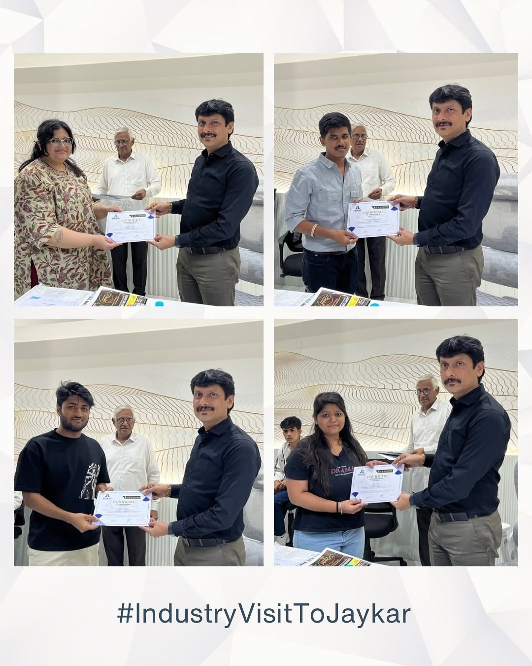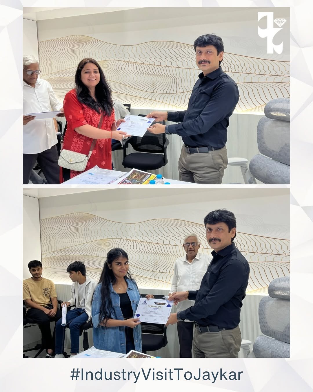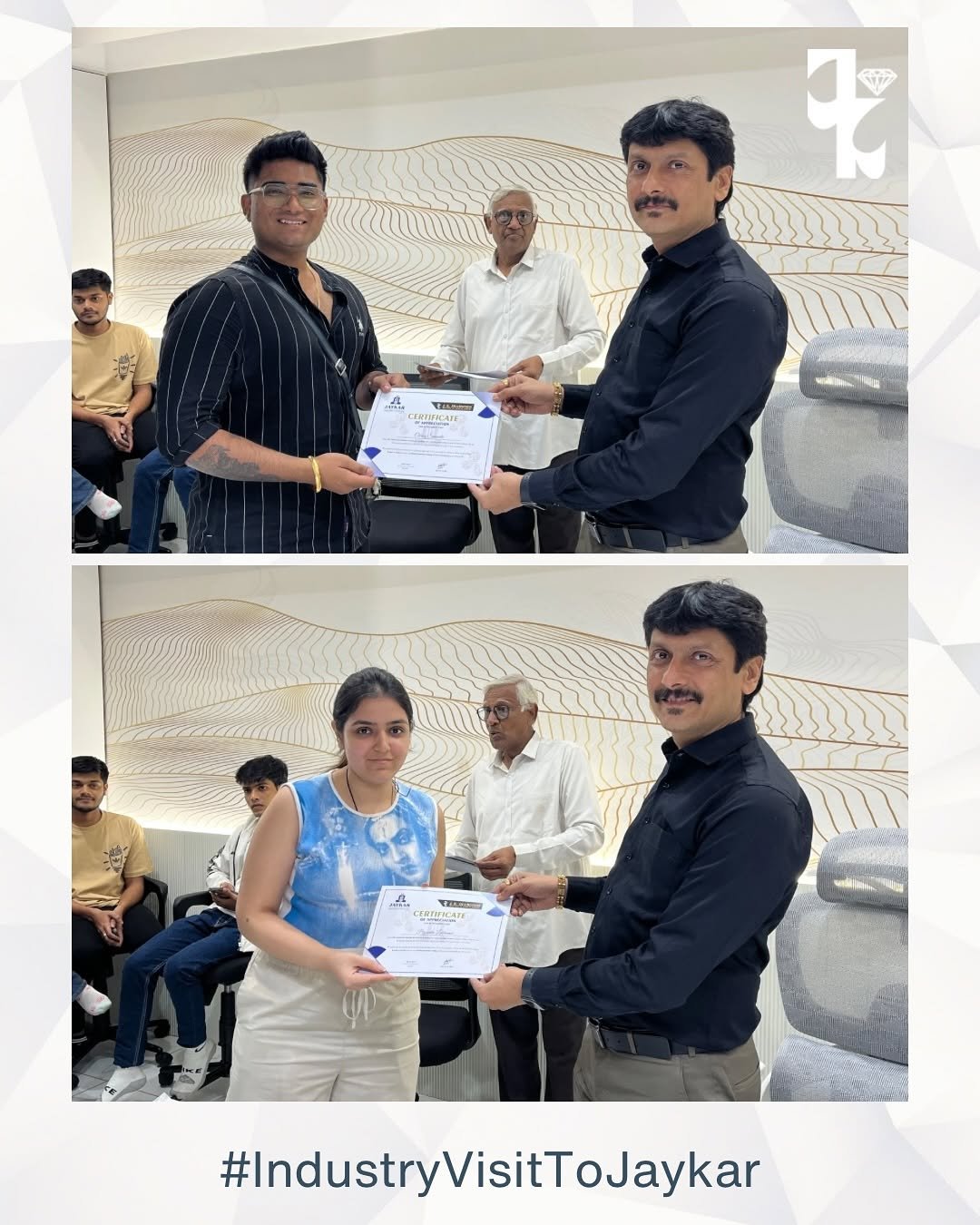 Next, at Jaykar Group, students experienced the complete journey of a diamond—from its rough form to the final polished gem. Under the insightful mentorship of Mr. Heet Bhai, students not only deepened their understanding of the trade but were also awarded certificates for their participation.